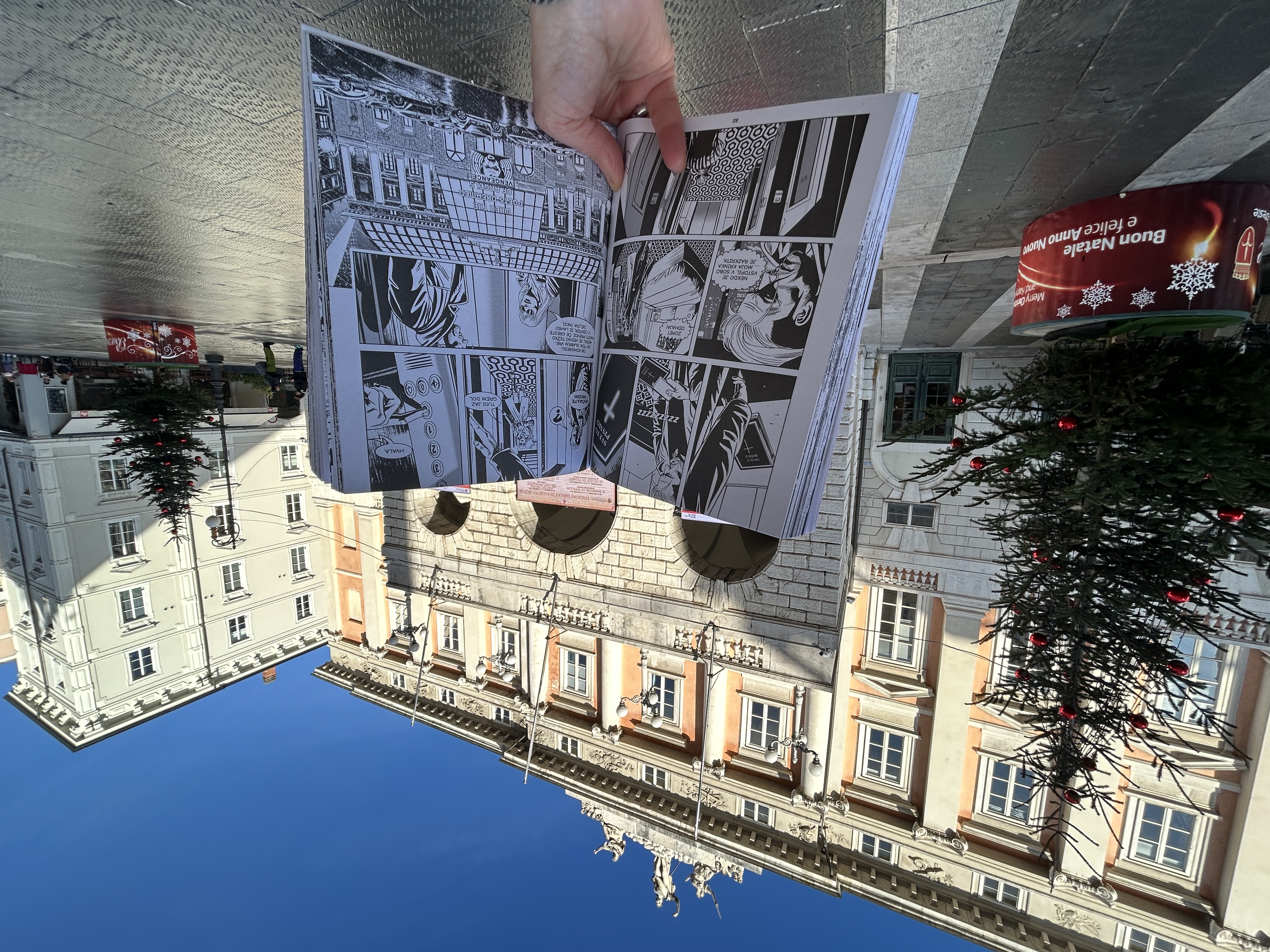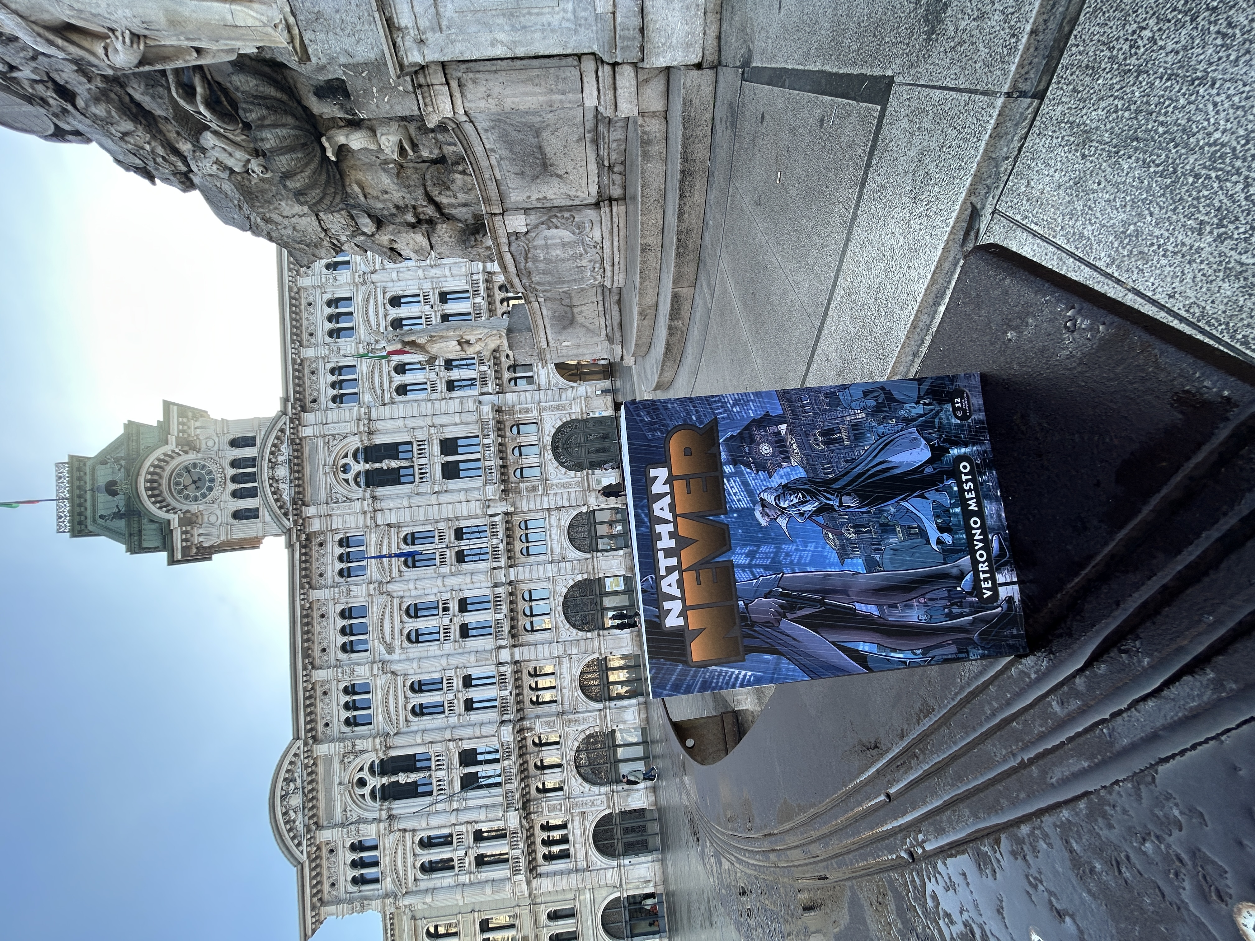 »Oprostite, ali bi mi pokazali naslovnico te knjige,« je skorajda sramežljivo začel mladenič, čigar dekle je gledalo v platnice s skorajda enakim pričakovanjem kot on sam. V rokah sem držala najnovejšo publikacijo Založbe ZRC – te ponavadi ne nagovarjajo širokih množic, toda Nathan Never je očitno imel čudežno moč. Izvod stripa z naslovom Vetrovno mesto, ki sem ga hotela ovekovečiti dobesedno na kraju zločina, pred tržaškim gledališčem Verdi, je nemudoma potrdil svoj kultni značaj, mladi par pa je bil navdušen, da se je v preteklosti njun priljubljeni stripovski junak mudil tudi v njunem mestu. Italijanski izvirnik namreč nosi letnico 2020 – morda takrat še nista znala brati, če sta se že sploh rodila ...